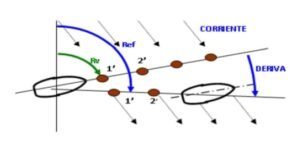 DERIVA: Es el ángulo que forma el rumbo efectivo con el que el buque debería de seguir en el caso de que no existiese corriente, que es igual al ángulo que sigue la dirección del buque con relación a la superficie y al fondo del mar.